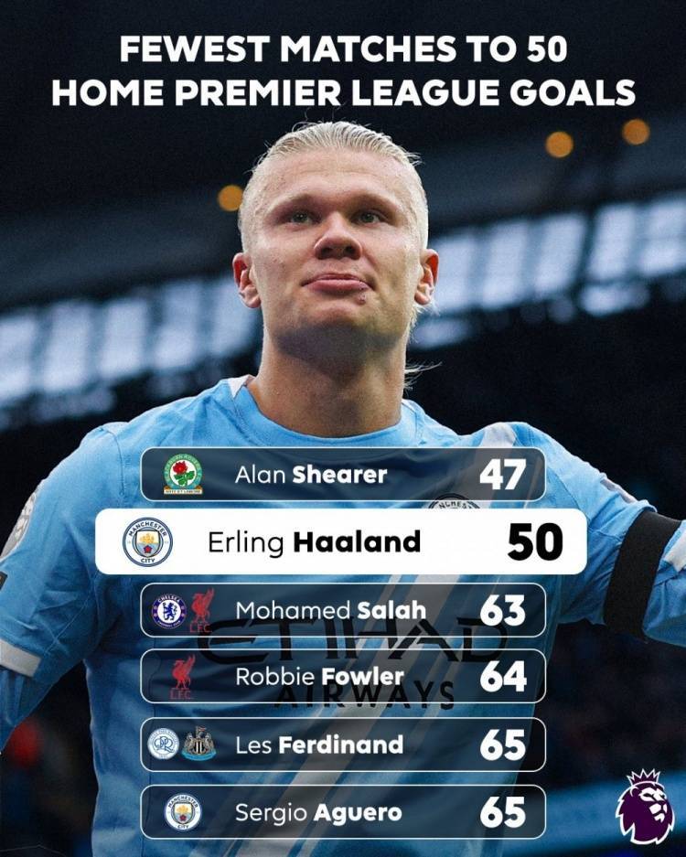 直播吧9月17日讯 英超官方统计,哈兰德在曼彻斯特德比中完成自己英超生涯的第50个主场进球。