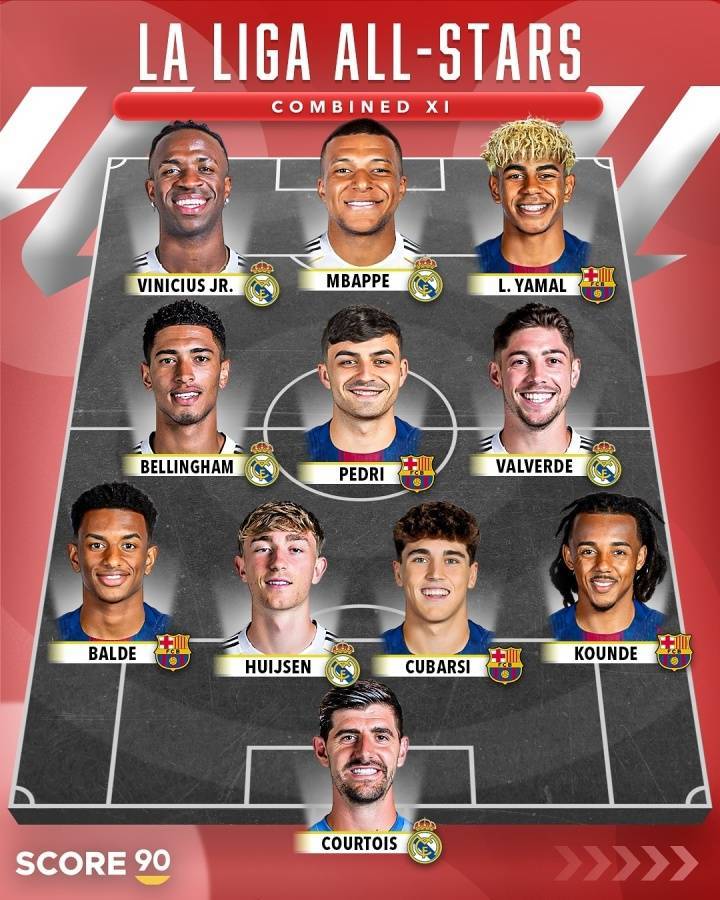直播吧08月16日讯 外媒SCORE90列出西甲、英超全明星阵容,并抛出提问:西甲联赛对阵英超全明星,谁将获胜?